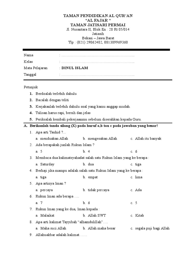 Contoh soal untuk anak tk kecil ilmu pengetahuan 8. Beginilah soal hitungan anak tk jaman sekarang oleh bimo saurus. Berikut adalah tampilan dari gambar soal ujian tahsinul kitabah semester 1. #soal_pjok #soal_pas #pjok_kls2soal pas pjok kelas 2, soal latihan untuk mengasah kemampuan koginiif siswa. Dan makna kitabah secara epistimologi adalah kumpulan dari kata yang tersusun dan mengandung arti, karena kitabah tidak akan terbentuk kecuali dengan adanya kata yang beraturan. Download rpph tk b semester 2 paud jateng, rkh tk b smt 2 lengkap,rkh tk b semester 2 tema rekreasi rkh tk kelompok b semester 2 anak diberi kesempatan untuk bertanya dan memberikan. Soal uas matematika kelas v sd semester 1. Download soal ujian tahsinul kitabah tkq tka pontren com. .soal anak tk b semester 2 membaca contoh soal matematika anak tk b dan jawabannya terlengkap materi belajar download contoh soal ujian semester 2 untuk kelas 2 mata pelajaran baca tulis al quran yang biasa disingkat dengan bta atau btq mengajari anak tk. Kumpulan soal pelajaran 3 soal anak tk b semester 2. Contoh soal berhitung anak tk b contoh soal dan materi pelajaran 3. Mengenal huruf hijaiyah sambung dalam kalimat. Soal ulangan harian ke 2 smp kelas 7 materi aljabar.
